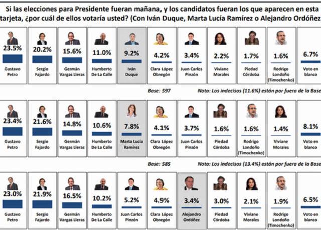 Según la encuesta Invamer, Petro lidera la intención de voto con el 23.5 %, seguido de Sergio Fajardo con el 20.2 % y en tercer lugar Germán Vargas Lleras con el 15.6 %. Humberto de La Calle Lombana e Iván Duque, obtuvieron en la encuesta un 10 %.