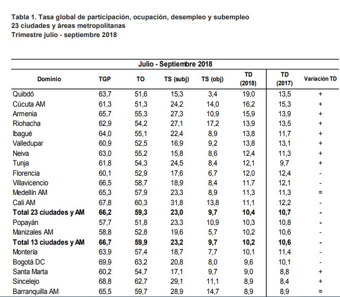 En el trimestre julio – septiembre 2018, la tasa de desempleo de las 13 ciudades y áreas metropolitanas fue 10,2%, para el trimestre julio – septiembre 2017 fue 10,6%. La tasa global de participación fue 66,7% y la tasa de ocupación 59,9%. Para el mismo trimestre de 2017 estas tasas se ubicaron en 67,2% y 60,1%, respectivamente.