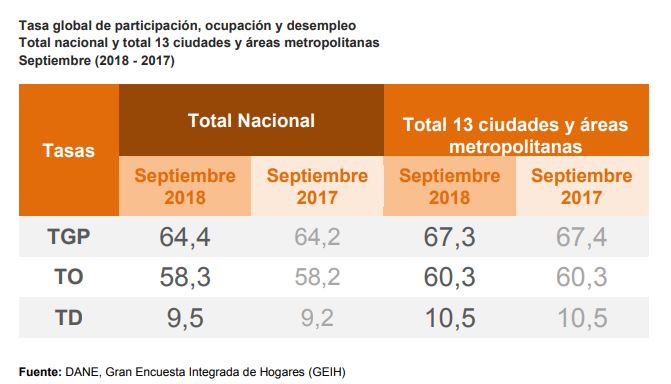 La tasa de desempleo para el total nacional en el trimestre julio – septiembre 2018 fue 9,5%, para el trimestre julio – septiembre 2017 fue 9,3%. La tasa global de participación fue 64,1% y la tasa de ocupación 58,0%. En el mismo trimestre de 2017 estas tasas fueron 64,1% y 58,1%, respectivamente.