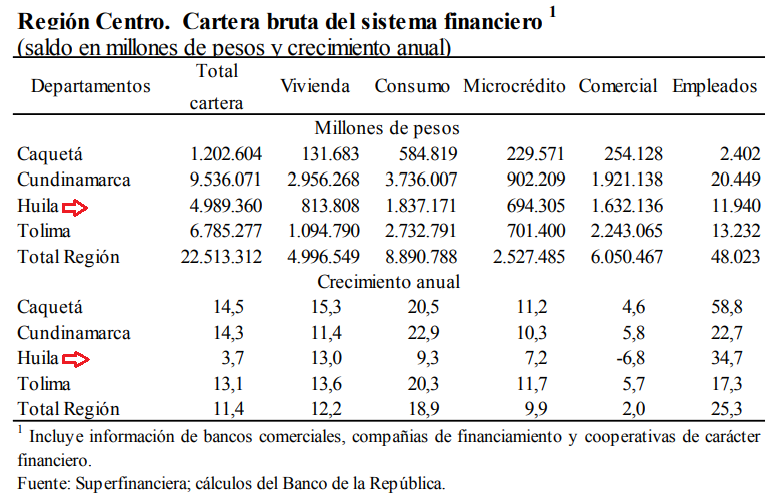 Cundinamarca concentró el mayor volumen y avance anual de los créditos, 42,4% y 14,3%, respectivamente, también se destacó el aumento de 13,1% en el Tolima, principalmente en consumo y vivienda, en tanto que en Huila solo fue de 3,7%, y con reducción en la línea comercial.