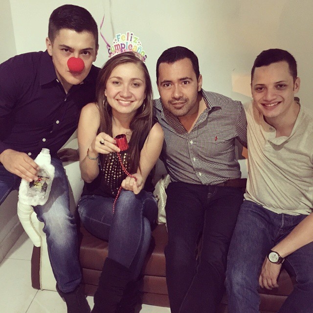 Con una fiesta sorpresa, los compañeros y amigos de Fabián Murcia celebraron su cumpleaños. Con torta, globos, regalos y disfraces los jóvenes celebraron su noche. Fabián Murcia, Diana Aguilar, Germán Vinasco y Felipe Rincón López.
