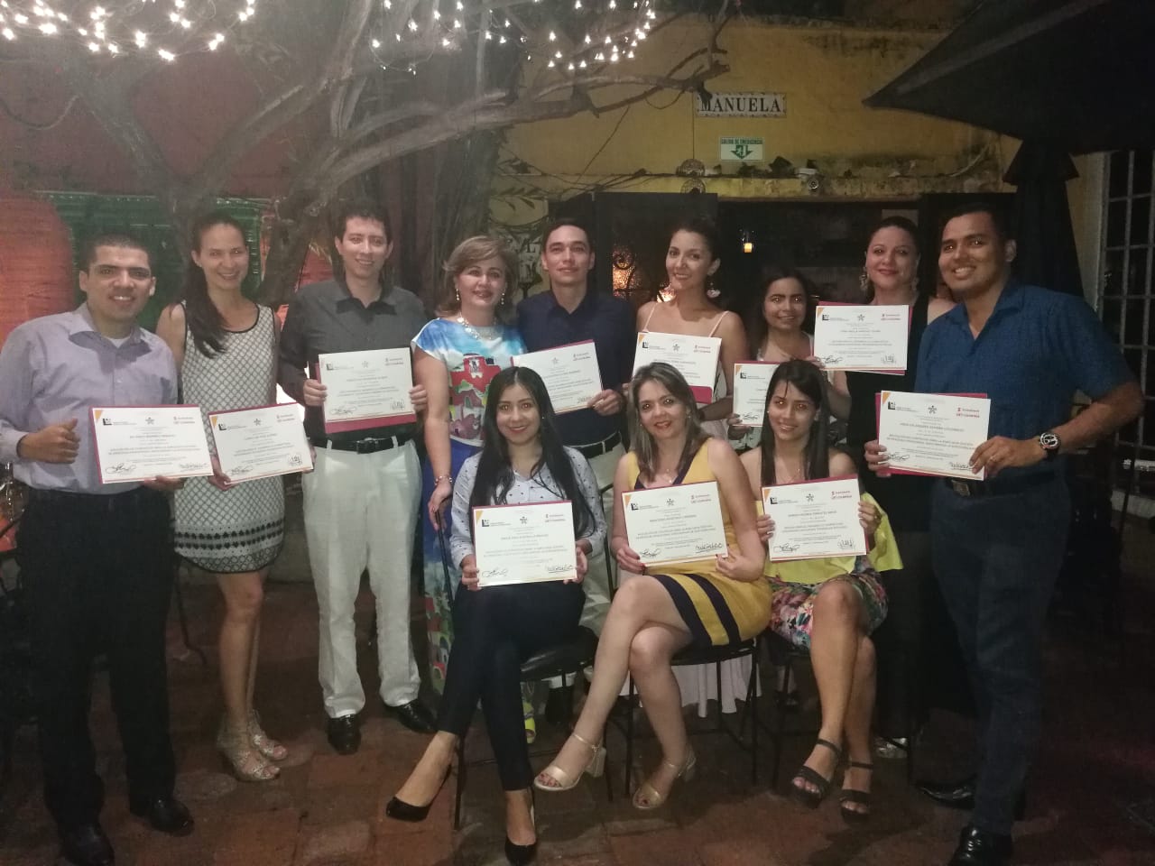 Recibiendo el dimplomado están Ricardo Bermeo , Carolina Díaz , Sebastian Andrade , Elsa Collazos ,Alexander Flórez , Nadia Pérez , Gina Sánchez , Gina Vargas, Marlon España (sentadas Angie Bonilla , Mercedes Martínez , Karen Pimentel
