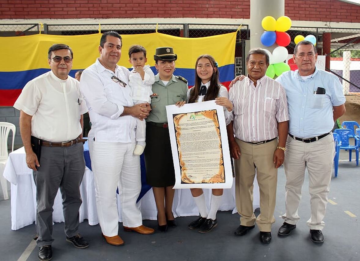El presidente de la Asamblea del Huila, Julio César Díaz Cruz, entregó un reconocimiento a la rectora del colegio San Miguel Arcángel, Capitán Dora Lilia Pacheco Oviedo, quien cumplió 13 años en la policía.