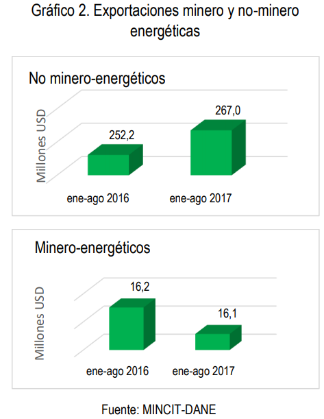 En el caso de las exportaciones no minero-energéticas, aquellas que registraron mayor variación en los primeros ocho meses de 2017 fueron: las exportaciones agropecuarias con un crecimiento del 6,2% y maquinaria y equipo. Por su parte, las exportaciones minero-energéticas registraron un descenso del 0,6% respecto al mismo periodo del año anterior.