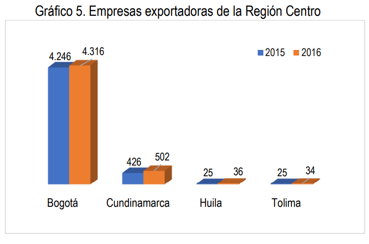En este aspecto, la región Centro, conformada por Bogotá, Cundinamarca, Huila y Tolima, concentra el 51% de las empresas exportadoras del país. Huila, por su parte, concentra el 1% de las empresas exportadoras de la región.