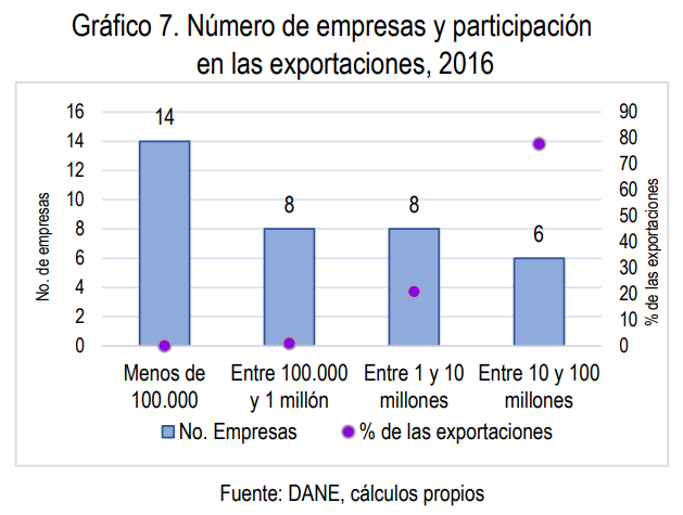 Si hablamos por tamaño, el 28,1% de las empresas exportadoras son grandes y dan cuenta del 87,1% de las exportaciones totales. Las pymes, por su parte, concentran el 31,3% del número de unidades y participan con el 12,6% de las exportaciones y las microempresas representan el 40,6% de las unidades exportadoras y contribuyen con el 0,3% de las exportaciones.