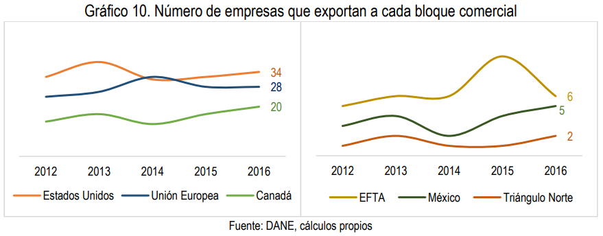 Finalmente, según el estudio al observar en destalle el número de empresas exportadoras por TLC destino, se destaca Estados Unidos como principal mercado al que exportan 34 empresas, seguido por la Unión Europea con 28 empresas y Canadá con 20 empresas.