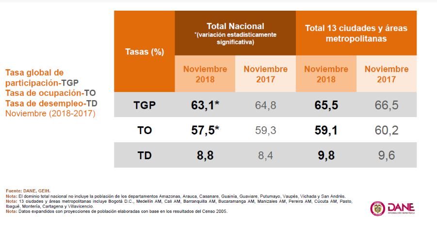 En noviembre de 2018 la tasa de desempleo en el total nacional fue 8,8 % y en el total 13 ciudades y áreas metropolitanas fue 9,8 %, reportó el DANE, el cual advirtió “un incremento histórico” en la población inactiva en Colombia.