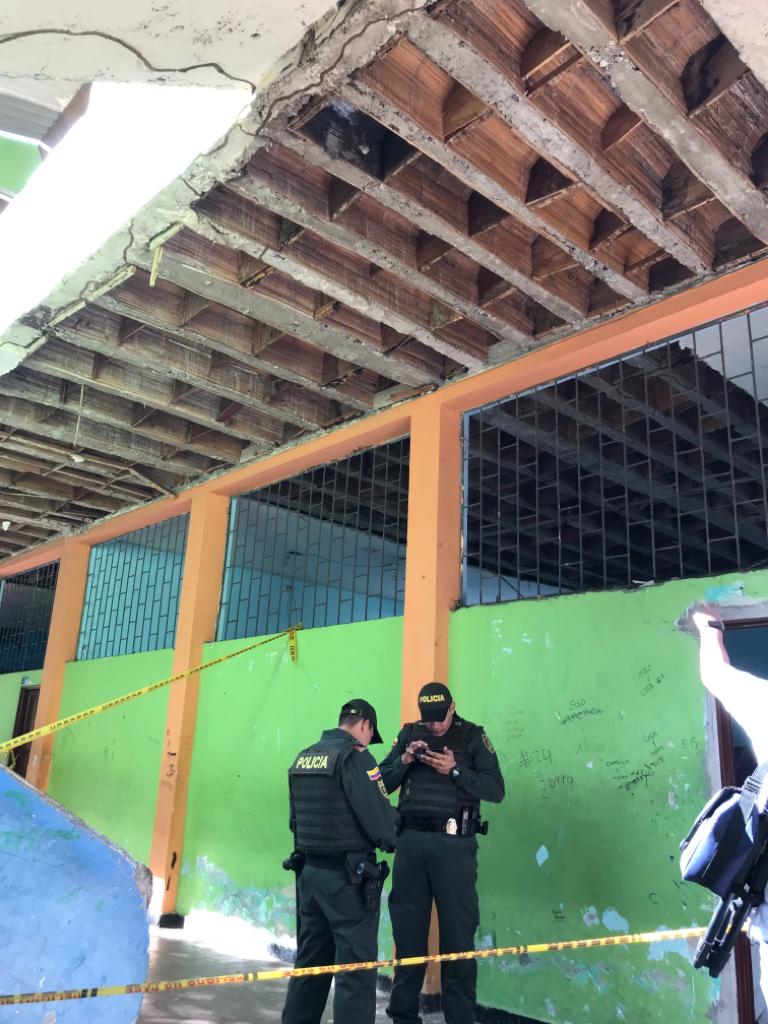 El jefe de Oficina de Gestión del Riesgo municipal, Pedro Pablo Tinjacá Ruíz, informó a este medio de comunicación que la emergencia se presentó hacia las dos de la tarde de ayer, pero pudo haber sido mayor pues solamente “se cayó una parte del techo de ese sitio, pero todos los techos del colegio son de la misma forma: viejos, de un colegio que tiene muchos años”.