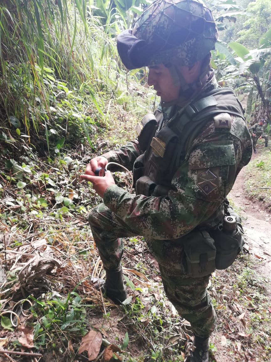 Se trata de una Mina Antipersonal, MAP, y un Artefacto Explosivo Improvisado, AEI, que fueron ubicados por soldados del Batallón de Alta Montaña n.° 9 orgánicas de la Novena Brigada, gracias al empleo del binomio canino y a las labores de registro y control.