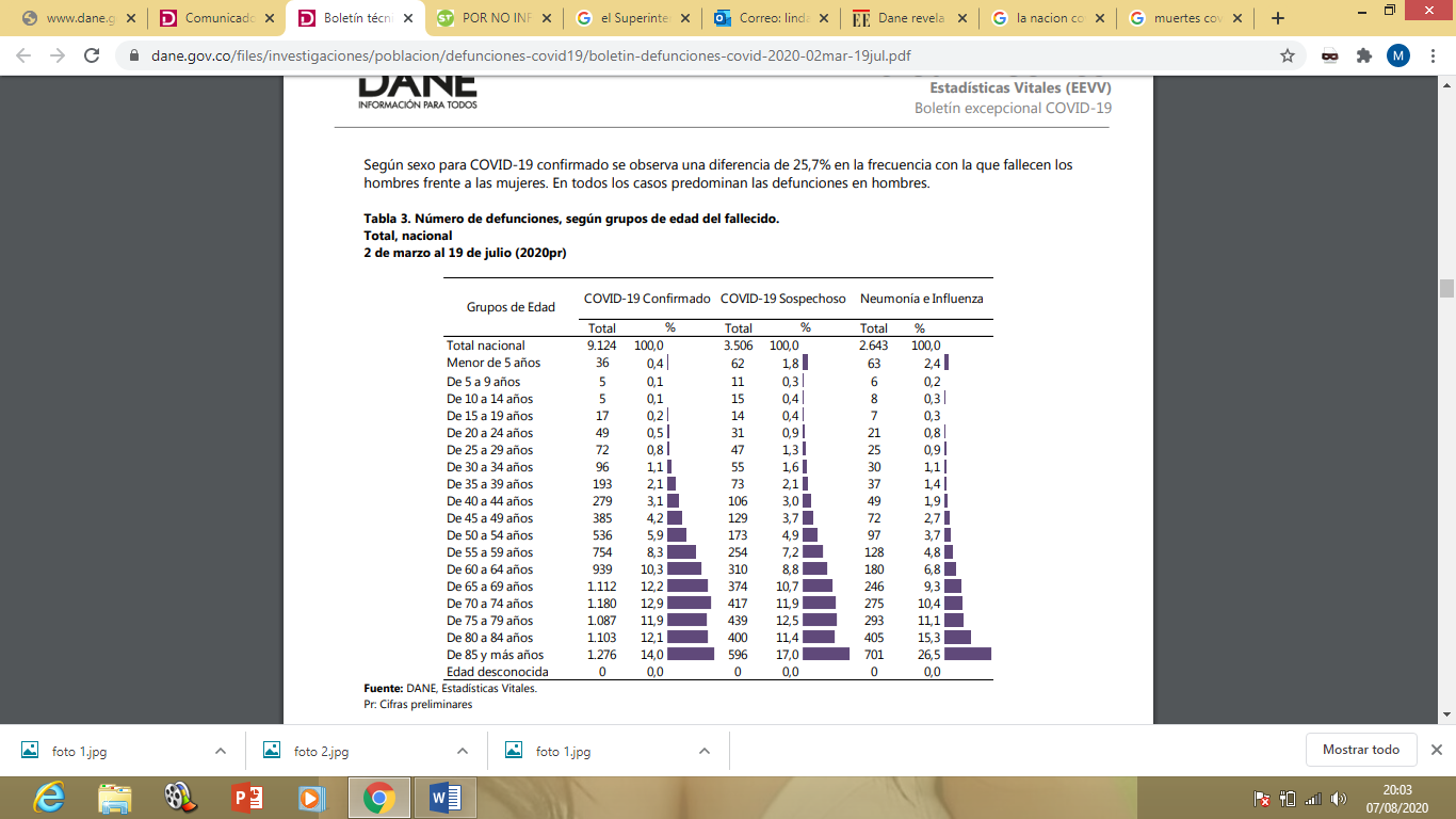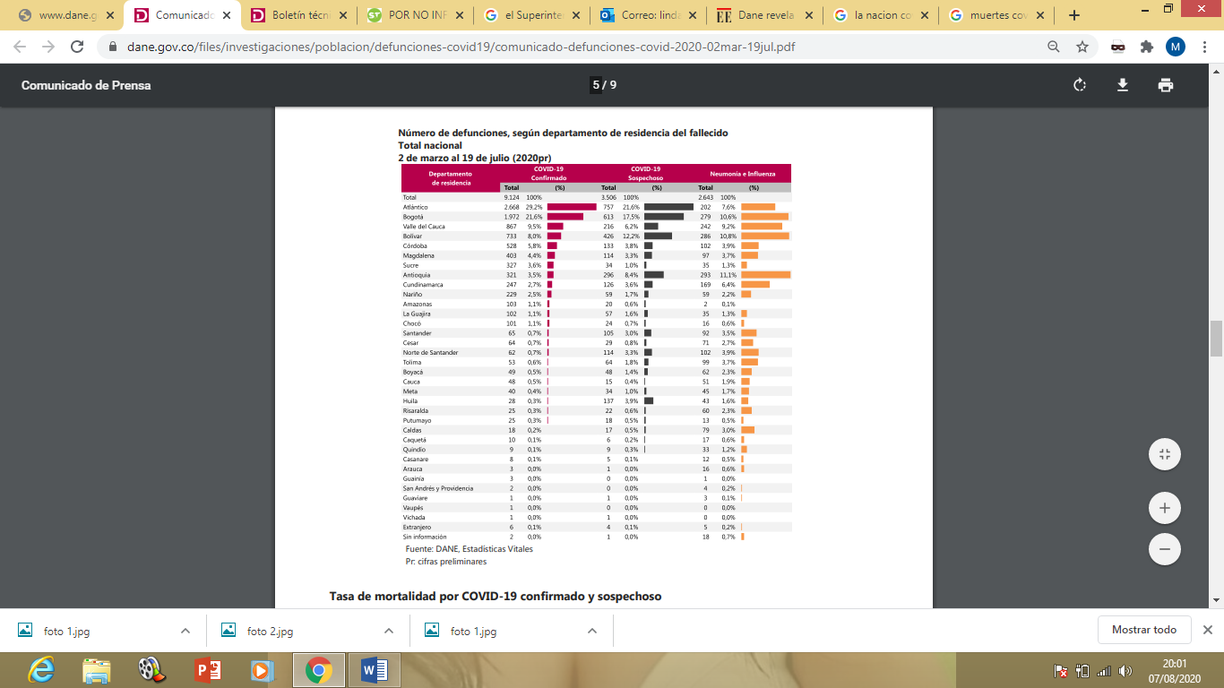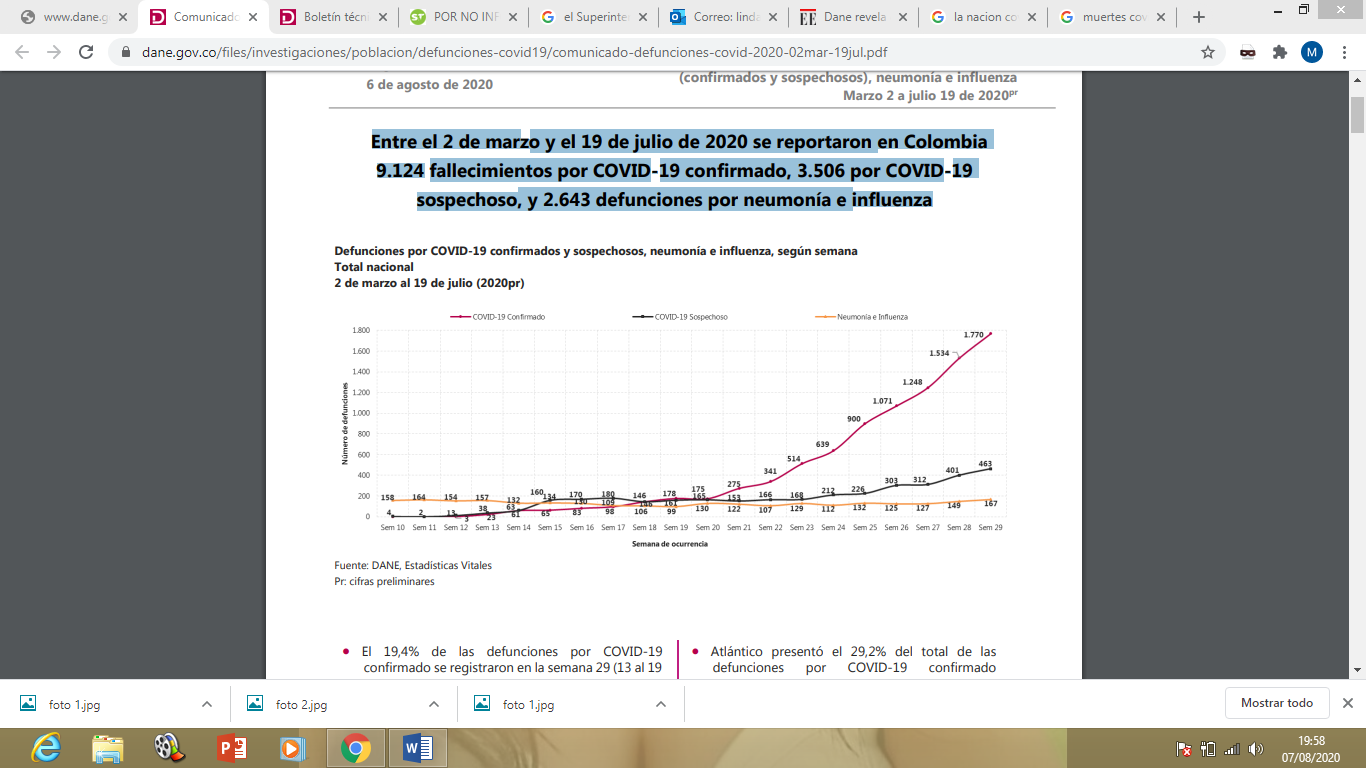 El Departamento Administrativo Nacional de Estadística, DANE, presentó un informe sobre defunciones en Colombia de marzo a julio del 2020 y aseguró que en este periodo se reportaron 9.124 fallecimientos por COVID-19 confirmados, 3.506 casos sospechosos de COVID-19.