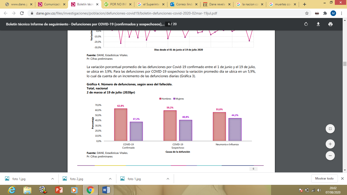 Asimismo, el informe del DANE revela que un 37,2% de las muertes por covid-19, son mujeres, y los fallecimientos sospechosos por esta enfermedad se distribuyeron en 59,2% y 40,8%, respectivamente, durante el 2 de marzo y el 19 de julio.