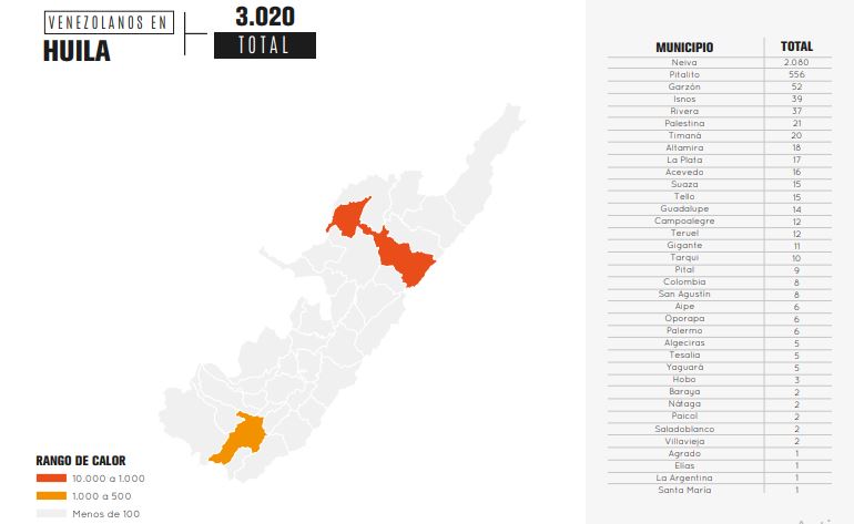 En lo que respecta al departamento del Huila, el informe señala que existen 3.020 ciudadanos venezolanos que están actualmente registrados; la cifra corresponde al 0,21% del total de la población que actualmente existe en toda la geografía nacional.